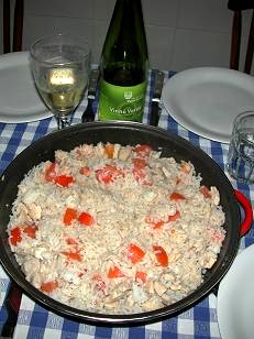 vinho e deixe cozinhar um pouco. Misture o arroz. Pique o tomate,