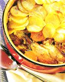 Tire a pele do frango. Coloque uma parte das batatas sobre a base de uma travessa alta ou panela de forno, salpimente e coloque tomilho. Coloque por cima o frango, espalhe o bacon, a cebola e a cenoura (estas bem no fundo para cozinharem melhor). Salpimente generosamente e coloque o restante das batatas por cima fechando tudo. Jogue por cima a cerveja e pincele as batatas com a margarina e cubra a panela. Asse em forno pré-aquecido a 160º durante umas 2 horas, na última meia hora com a panela destampada para dourar as batatas, e se achar melhor, aumento o forno para 180º. Verifique antes de servir se as batatas de cima ficaram bem cozidas.