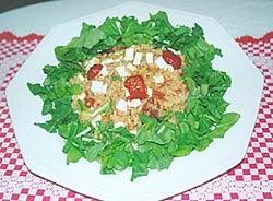 Em uma panela, aqueça o azeite o alho de doure. Junte metade do tomate seco, metade da rúcula e deixe dourar. Misture o arroz e deixe tostar por alguns minutos. Adicione o vinho e deixe-o evaporar em fogo alto. Vá acrescentando aos poucos o caldo de carne até o ponto de fervura. Quando faltarem dois minutos para o final, acrescente a ervilha, o restante do tomate seco e da rúcula. Adicione o restante da manteiga, o parmesão e a mussarela de búfula cortada em cubos. Sirva decorando o prato com folhas de rúcula e a mussarela em cubos.